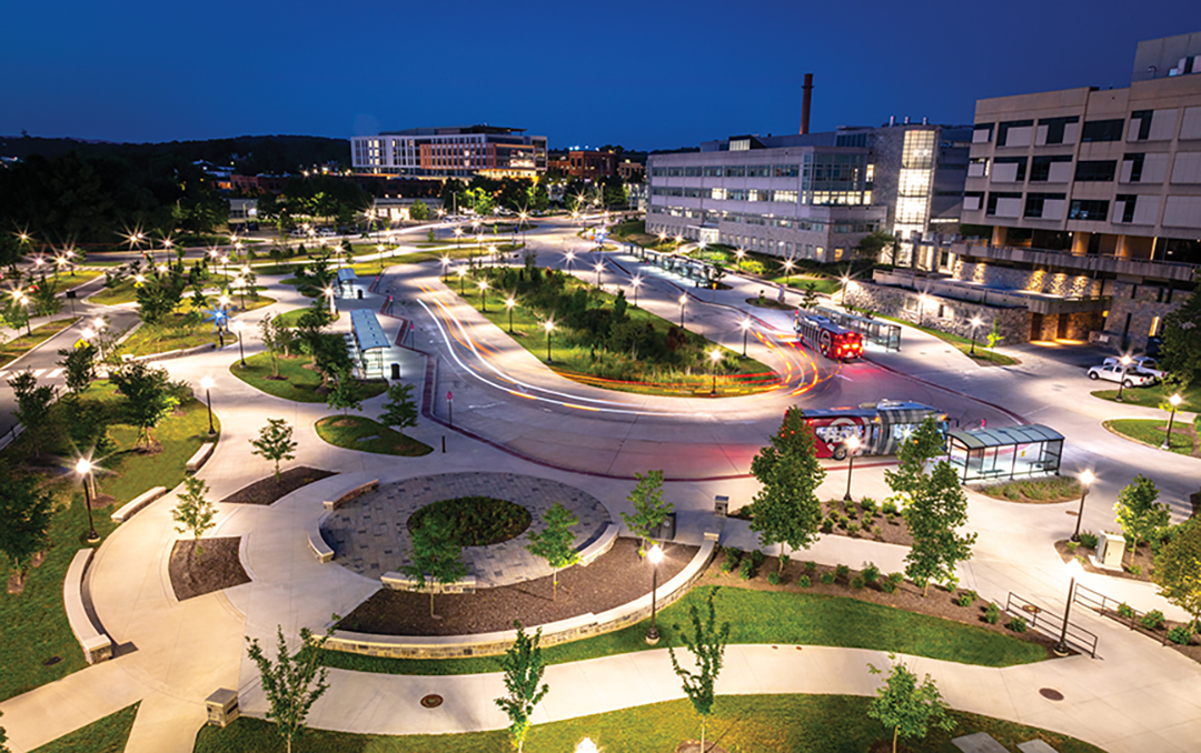 Complex site conditions required careful planning, including a 100-year floodplain, existing underground utilities, and varied topography. Innovative grading solutions enabled ADA-compliant access throughout the site, while a busy intersection was replaced with a roundabout and two bus transfer loops were added to streamline operations. Complete street features enhanced safety for pedestrians and cyclists. By addressing these challenges and exceeding performance and sustainability goals, the Multi-Modal Hub provides a durable, community-focused model for modern campus transit infrastructure.