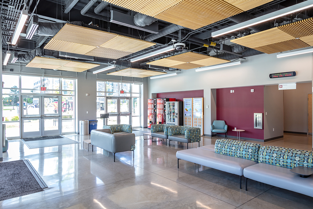 Innovation is evident in the facility’s transportation infrastructure. Bus slips feature permanent canopies with Wi-Fi, charging stations, and direct connectivity to campus security. Four slips include battery-electric charging, with additional in-ground inductive charging planned for future use. Advanced energy modeling guided the building’s placement and orientation, maximizing energy efficiency and long-term performance.